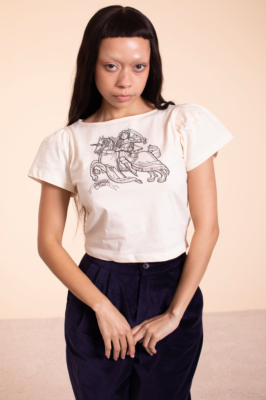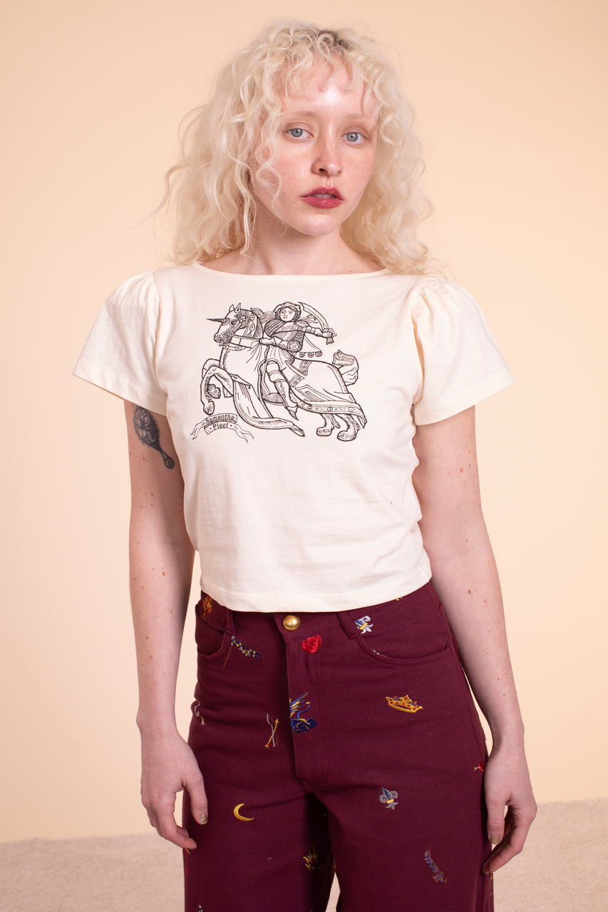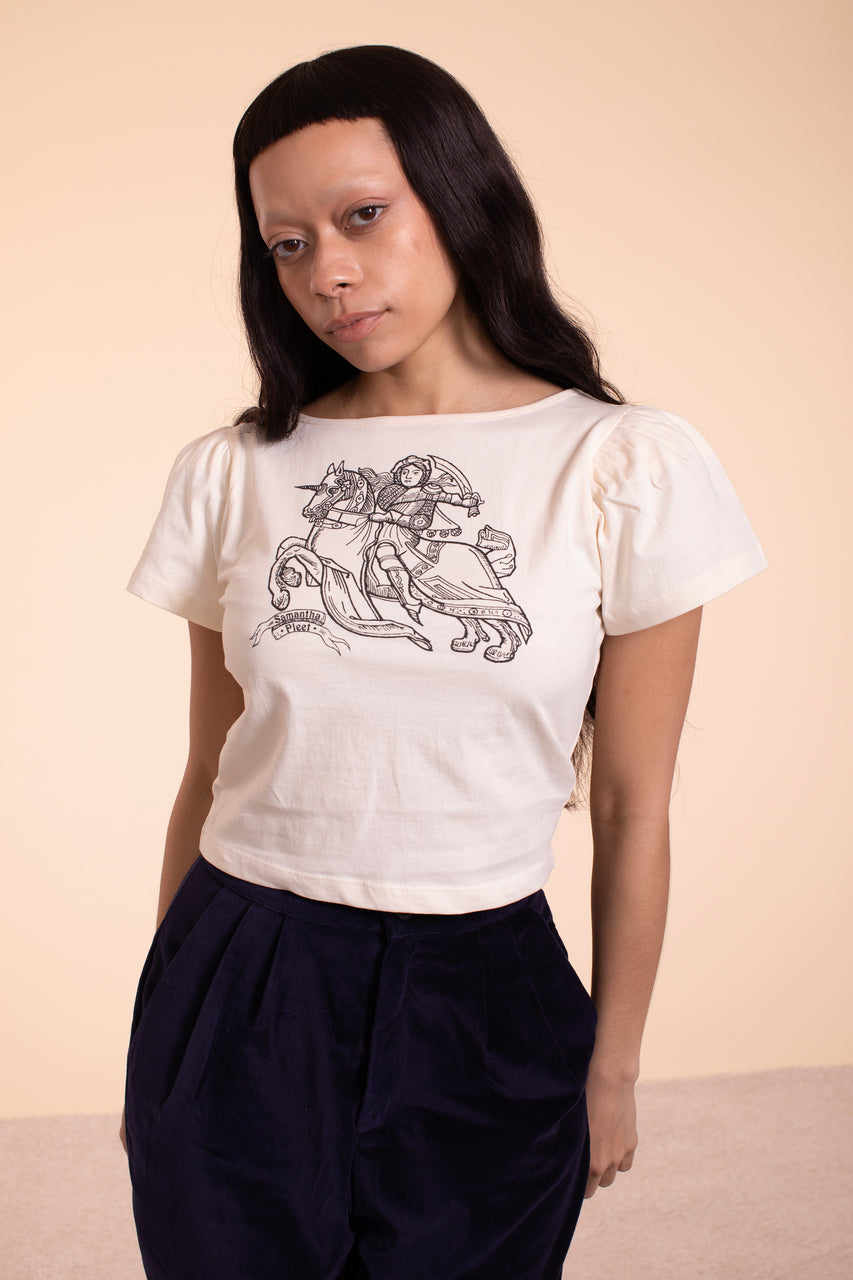 The latest in our series of screen printed T's and it's Joan of Arc. In a super soft antique white 100% cotton jersey. Fair trade made in India. This version is a feminine shape shown in size S. The hand silkscreened Joan of Arc and Samantha Pleet Banner make for a new iconic tee.