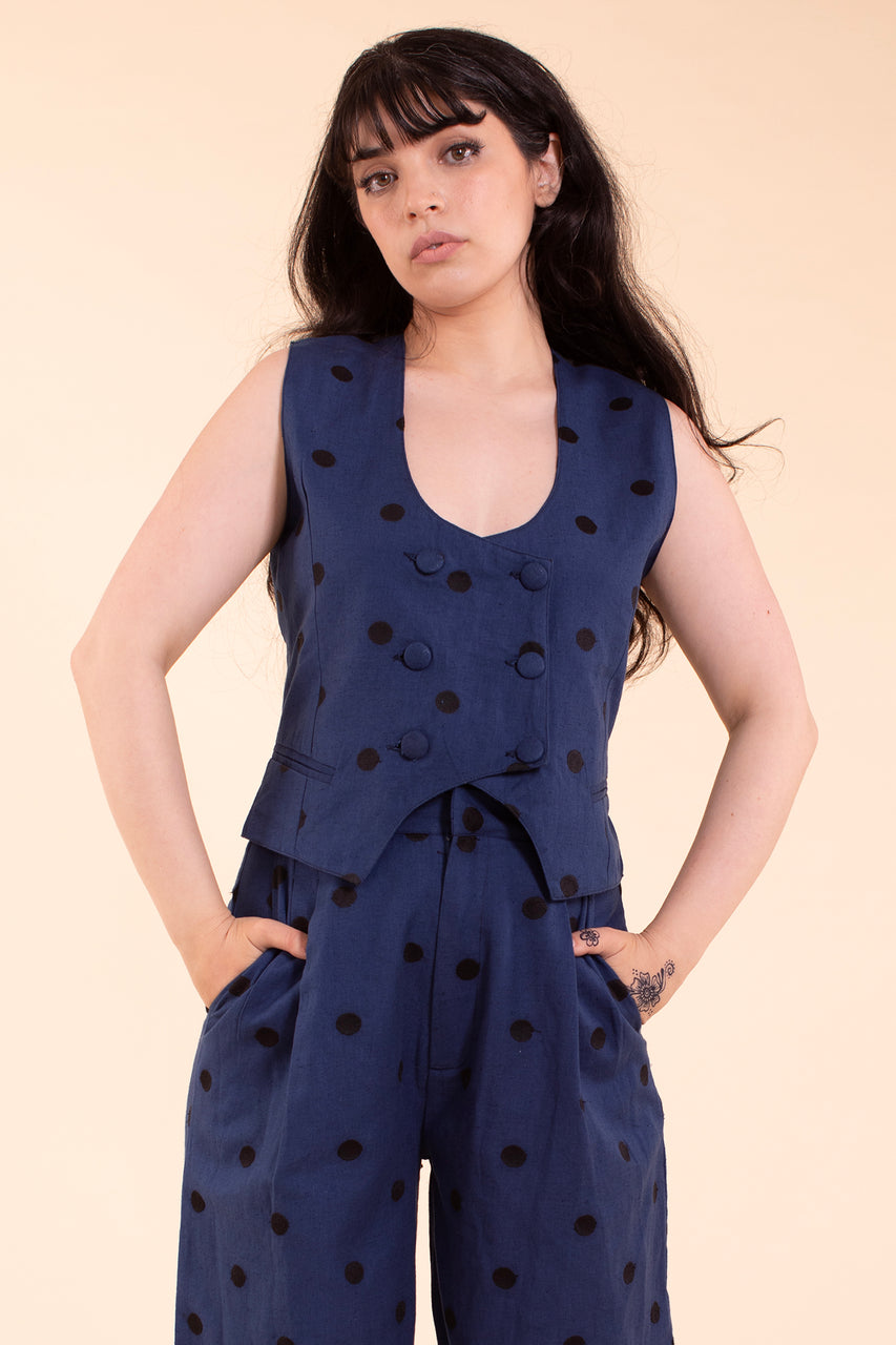 This vest is pure sunshine, crafted from 100% organic linen with a Taffeta back, it features a double breasted design with matching large covered buttons. The self belt adjuster at the back lets you tailor the fit perfectly around your waist. Shaped like a bustier yet styled as a vest, it hugs your silhouette beautifully, truly a magical piece to add to your collection.