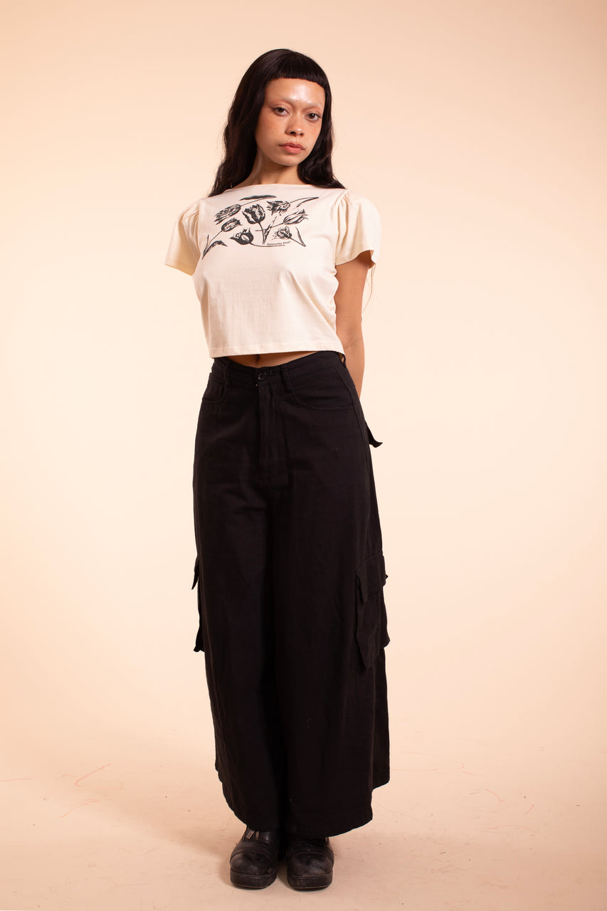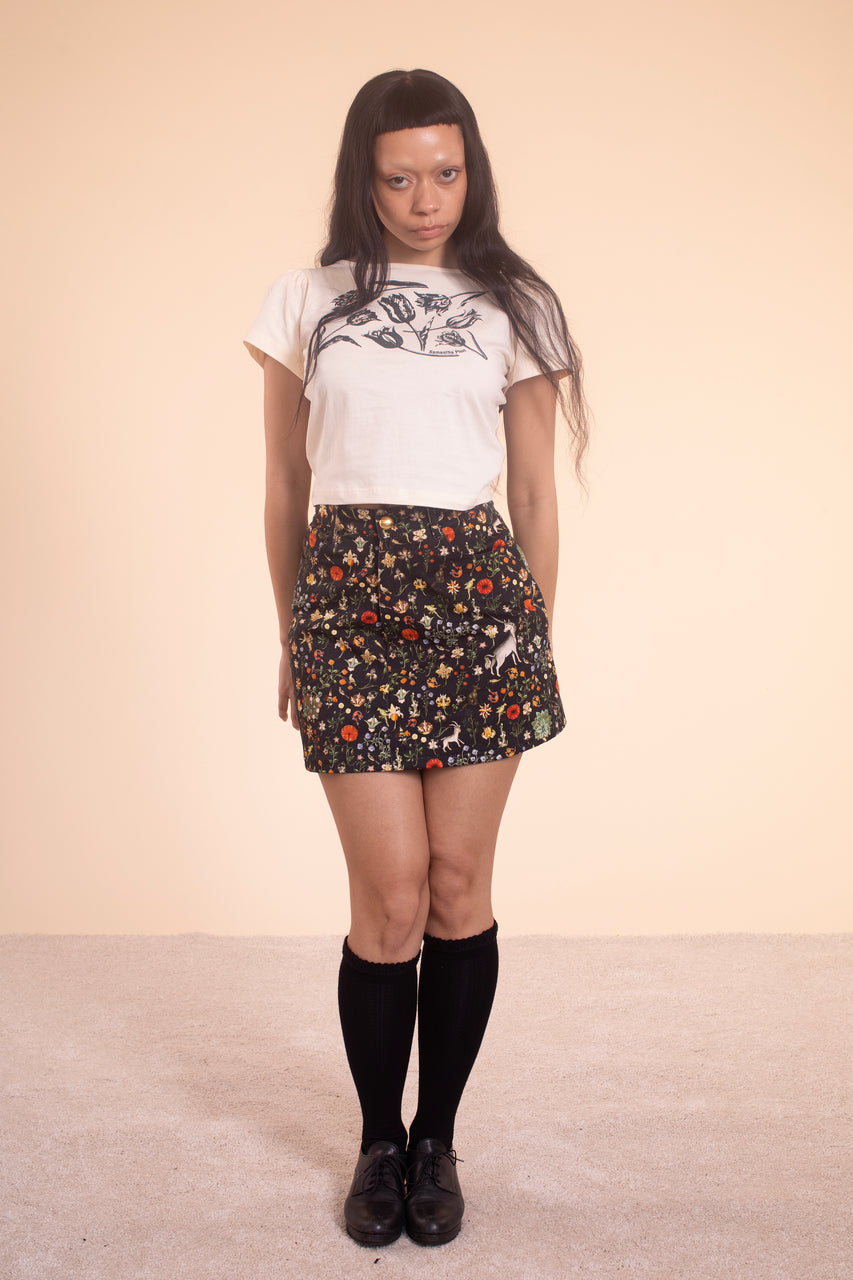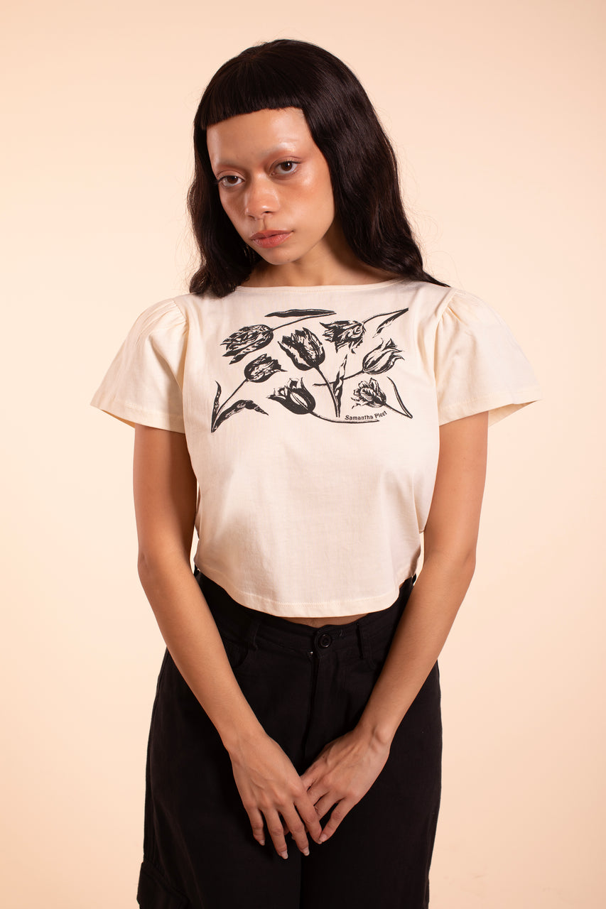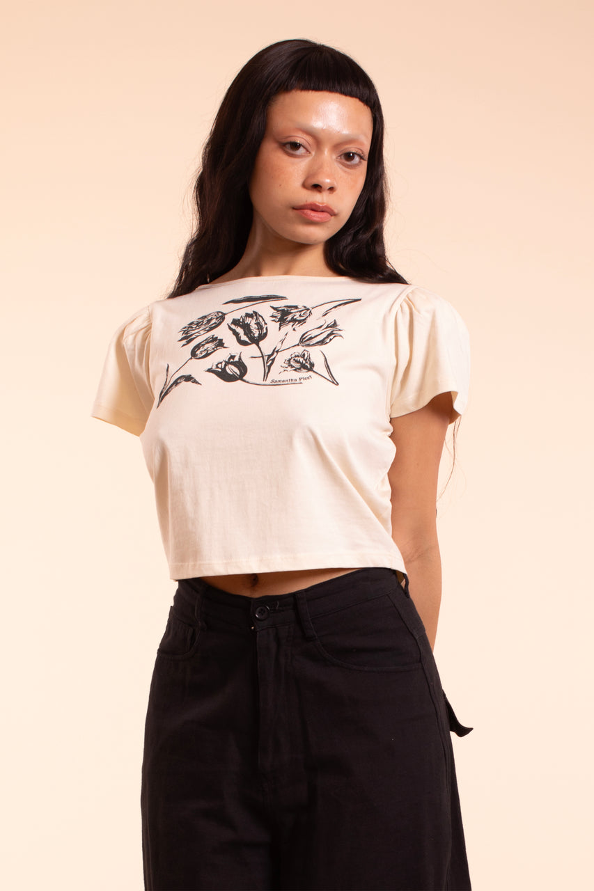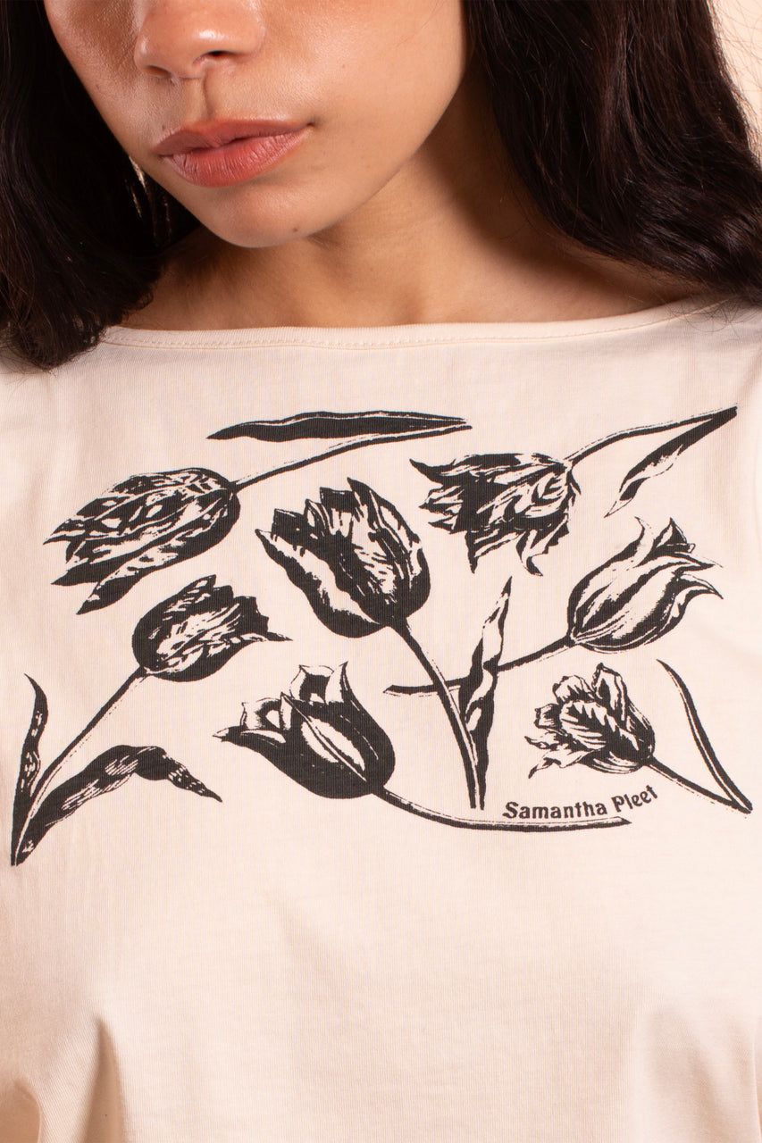 Our latest screen printed T and it's calling on the spring tulips. In a super soft antique white 100% cotton jersey. Fair trade made in India. This version is a feminine shape shown in size S. The hand silkscreened flowers are a great compliment to so many spring pieces.
