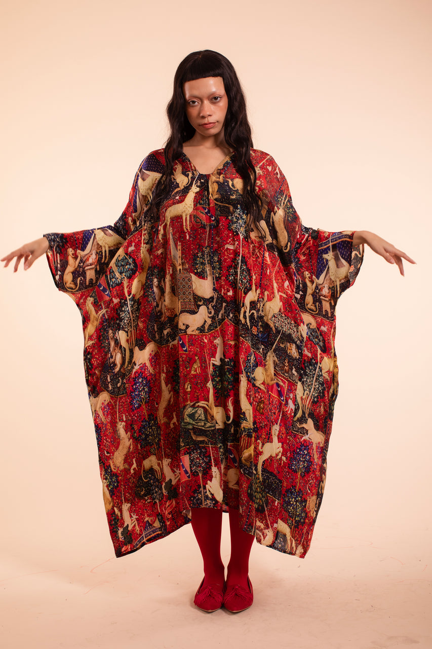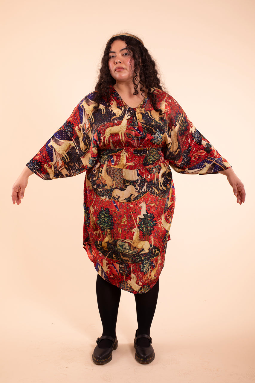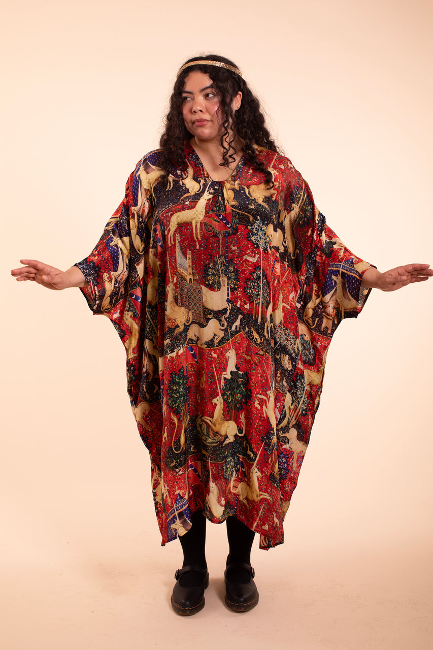 You will cast spells in this gorgeous robe dress that truly brings the house-designed Tapestry Print to life. Wear it as a giant flowing cape or cinch it with the included matching belt, perfect for any cocktail party of dreams but comfy enough for luxuriating at home. It feels amazing on as it's made from 50% silk and 50% sustainable modal. Fair trade made in India. One Size fits all XS-5X