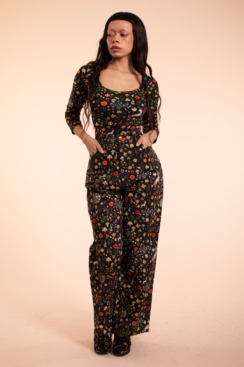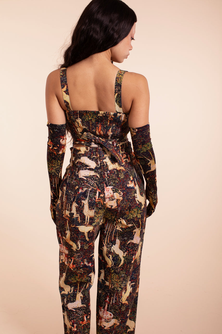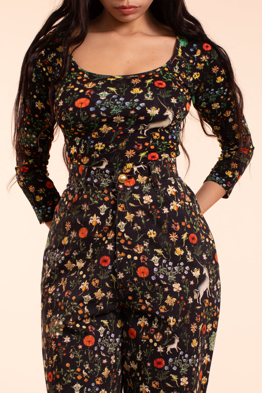 Everyone's favorite wide leg jean style, now offered here in the Black Illuminated print for the first time. This is our classic wide leg jean with jeans pockets and zipper fly. They are easy to wear but in the Black Illuminated print they will take any outfit into another realm. Made of the best crisp 100% cotton twill and fair trade Made in India, these Illuminated print beauties really are a piece of art where you become a character in the story and the Unicorns run free. back photos in tapestry just for detail