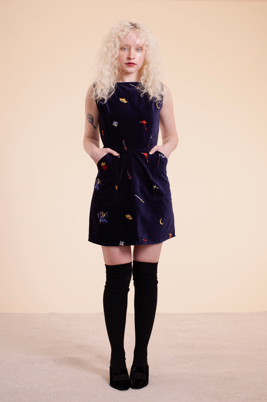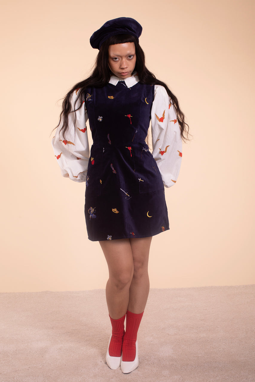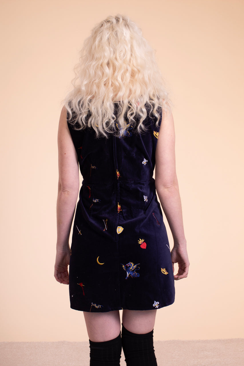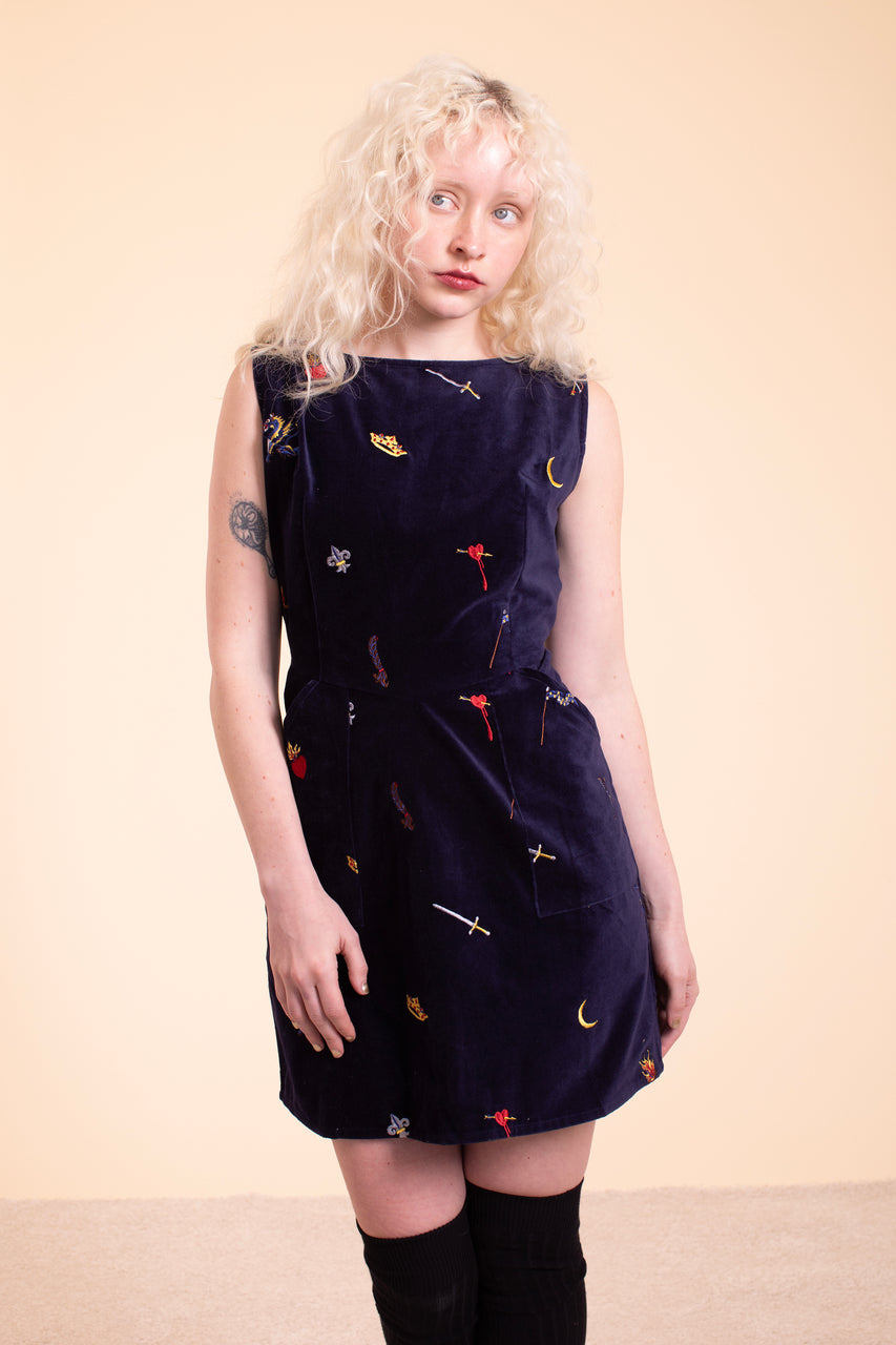 This perfect little dress made of cotton velvet is soft and dreamy yet powerful and sexy, perfect for throwing on for a night out.  It has pockets and is embroidered with a story inspired by Joan of Arc, complete with a cut off braid, a sword, dragons, and bleeding hearts. A flattering fit, broad neckline and hourglass shape with inspiration comes from the Gambeson, a garment typically worn under armor. 100% cotton Made in India
