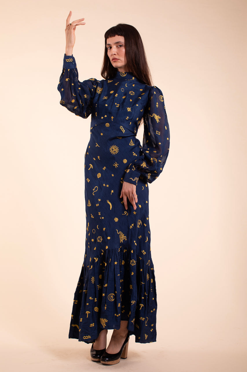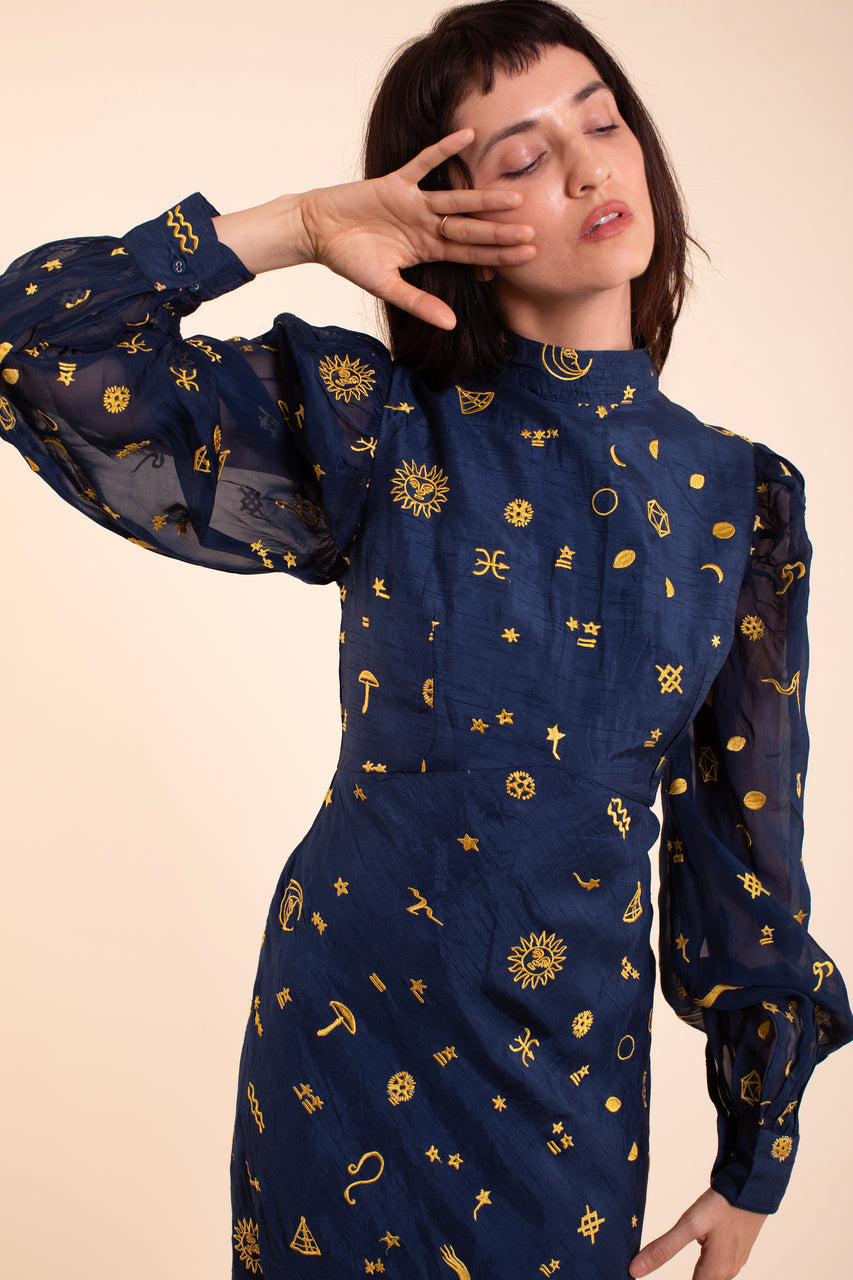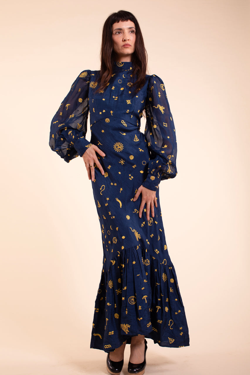 Dance in the moonlight in this truly magical dress. It's bias cut so it drapes upon your body just so. The sleeves are a sheer 100% silk organza that hovers on your ams just so. It has an amazing hemline that makes you look statuesque. Made with a soft silk dupioni with 50% silk 50% model, this natural fabric looks supernatural with dreamy floating candles. a very easy to zip zipper graces the back and there is a button at the top. Fair trade made in India. email info@samanthapleet.com to order sizes 18-24 to ship in 2 weeks, other sizes ship right away