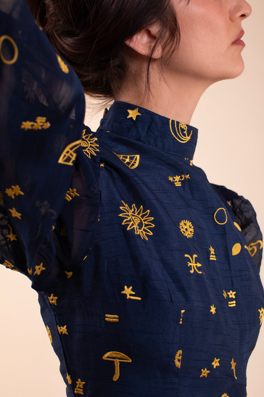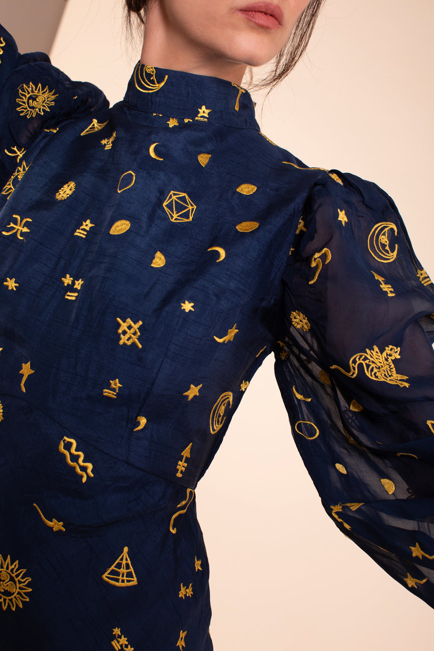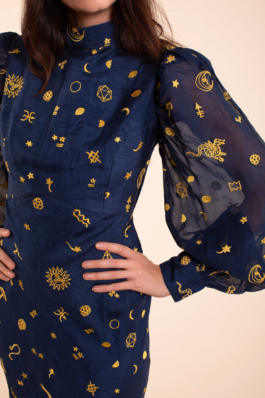 Dance in the moonlight in this truly magical dress. It's bias cut so it drapes upon your body just so. The sleeves are a sheer 100% silk organza that hovers on your ams just so. It has an amazing hemline that makes you look statuesque. Made with a soft silk dupioni with 50% silk 50% model, this natural fabric looks supernatural with dreamy floating candles. a very easy to zip zipper graces the back and there is a button at the top. Fair trade made in India. email info@samanthapleet.com to order sizes 18-24 to ship in 2 weeks, other sizes ship right away