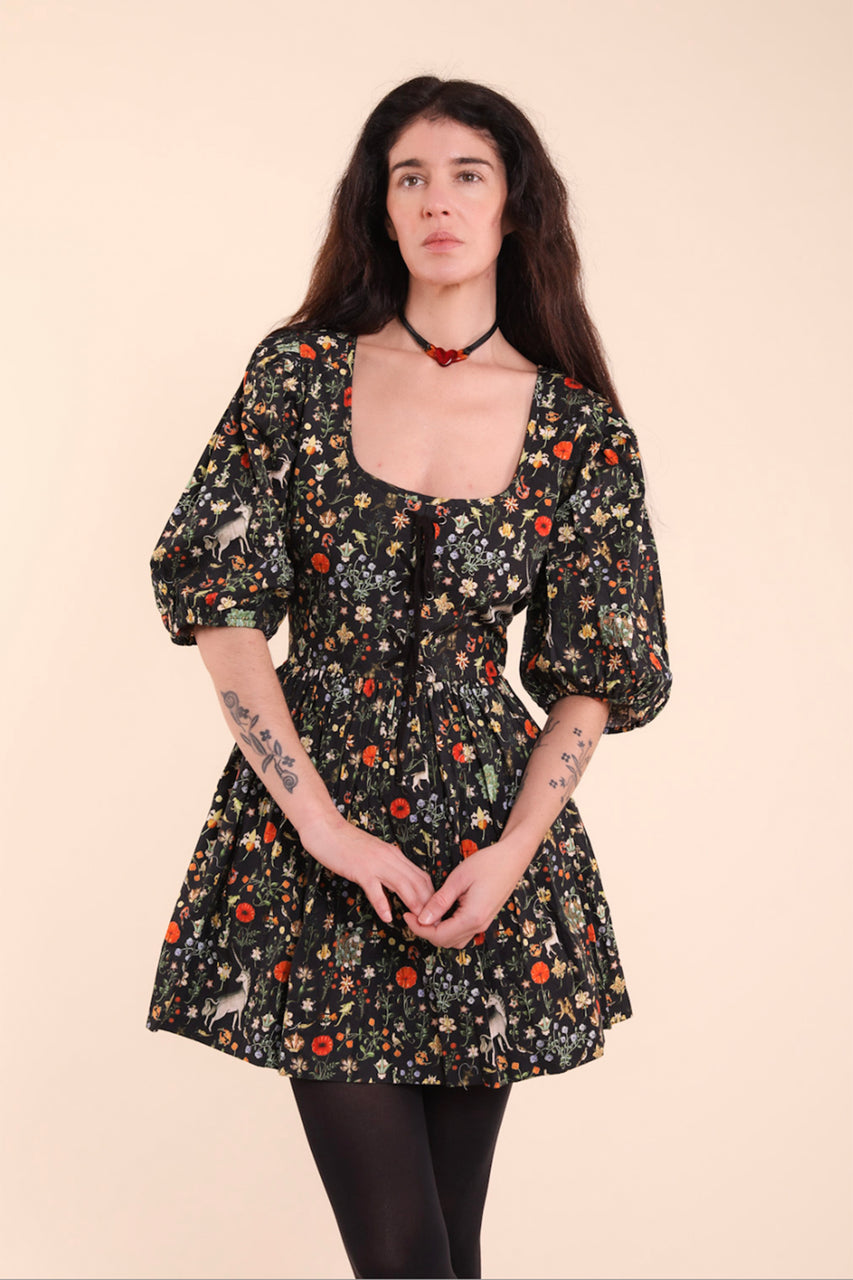 A lace up baby doll dress of your dreams with the perfect gathered skirt. This one also has side ties and a back zipper so you can cinch in the waist just so. The front lacing will not bunch as its tacked down and the sleeves can be pushed up or down with elastic. The flattering scooped neckline looks incredible with this stunning silhouette. Fair trade made in India with 100% cotton poplin in our iconic Black Illuminated print. Dress length measures 33" from hps for a size 4 and goes up from there.