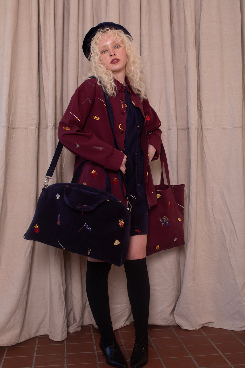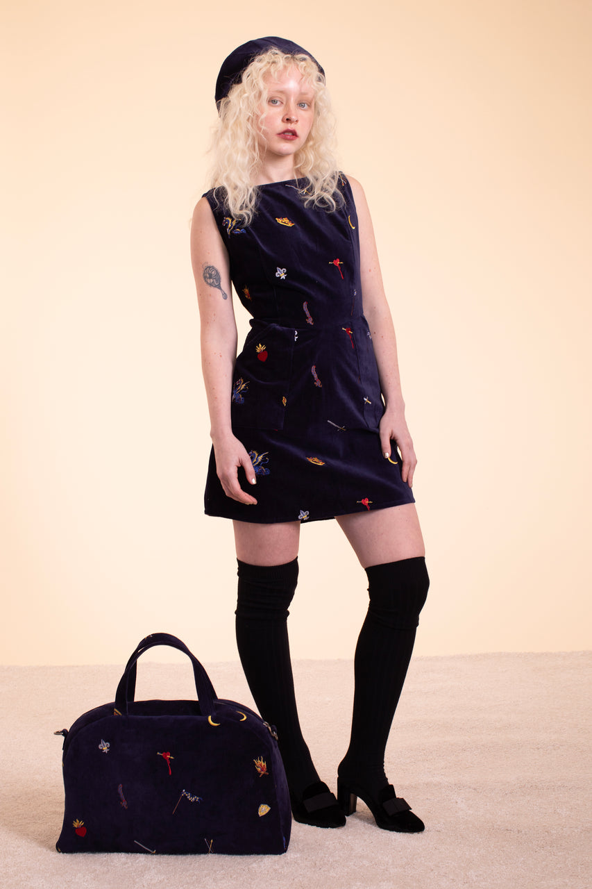 This bag is the perfect size for all your essentials for a weekend away. Stow a laptop, change of clothes, your toiletries and more. Inspired by a carpet bag there is no end to what you can fit in here. It comes with a clip on shoulder strap and features wonderful details such as an inside pocket and lining, heavy duty zipper, and metal feet on the bottom. Fair trade made in India with 100% cotton velvet and cotton lining.