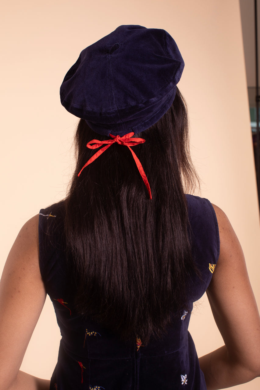 This magical little hat is a cut and sew beret, the perfect to compliment the velvet pieces in the Joan of Arc collection! The hat band is finished with an adjustable red accent drawstring so it can fit just right. Fair trade made in India with 100% cotton midnight velvet.