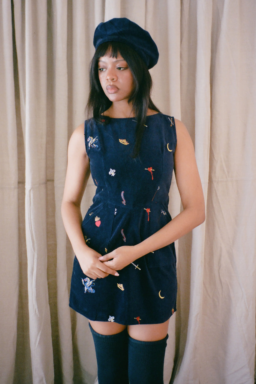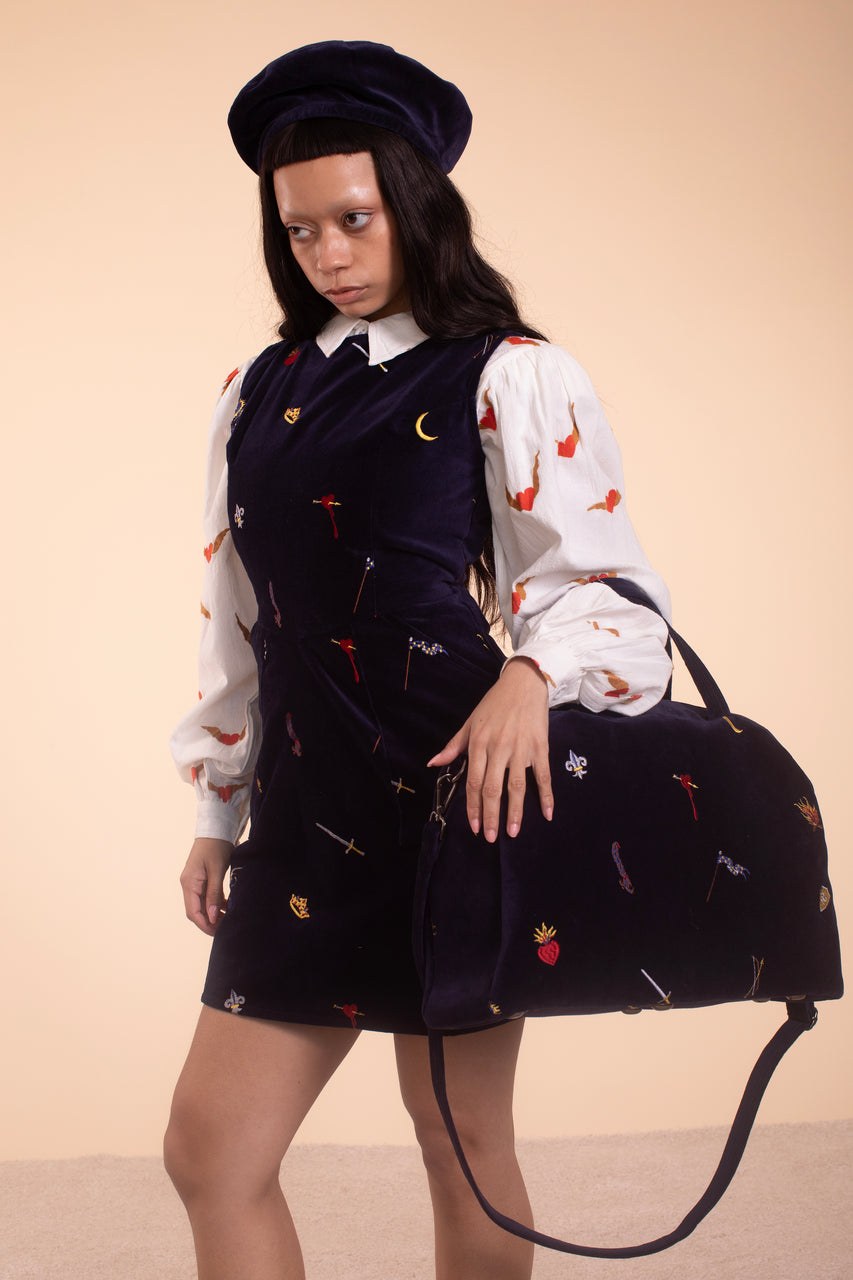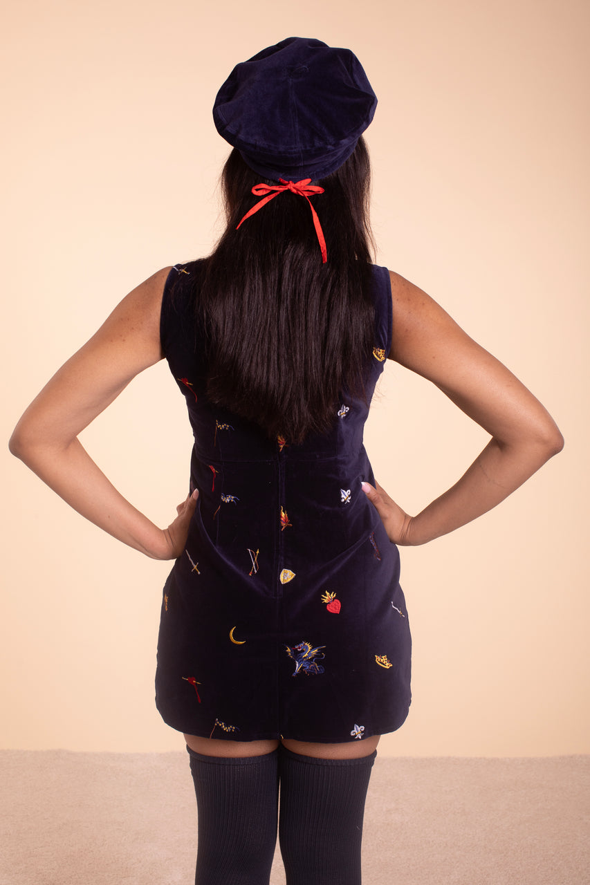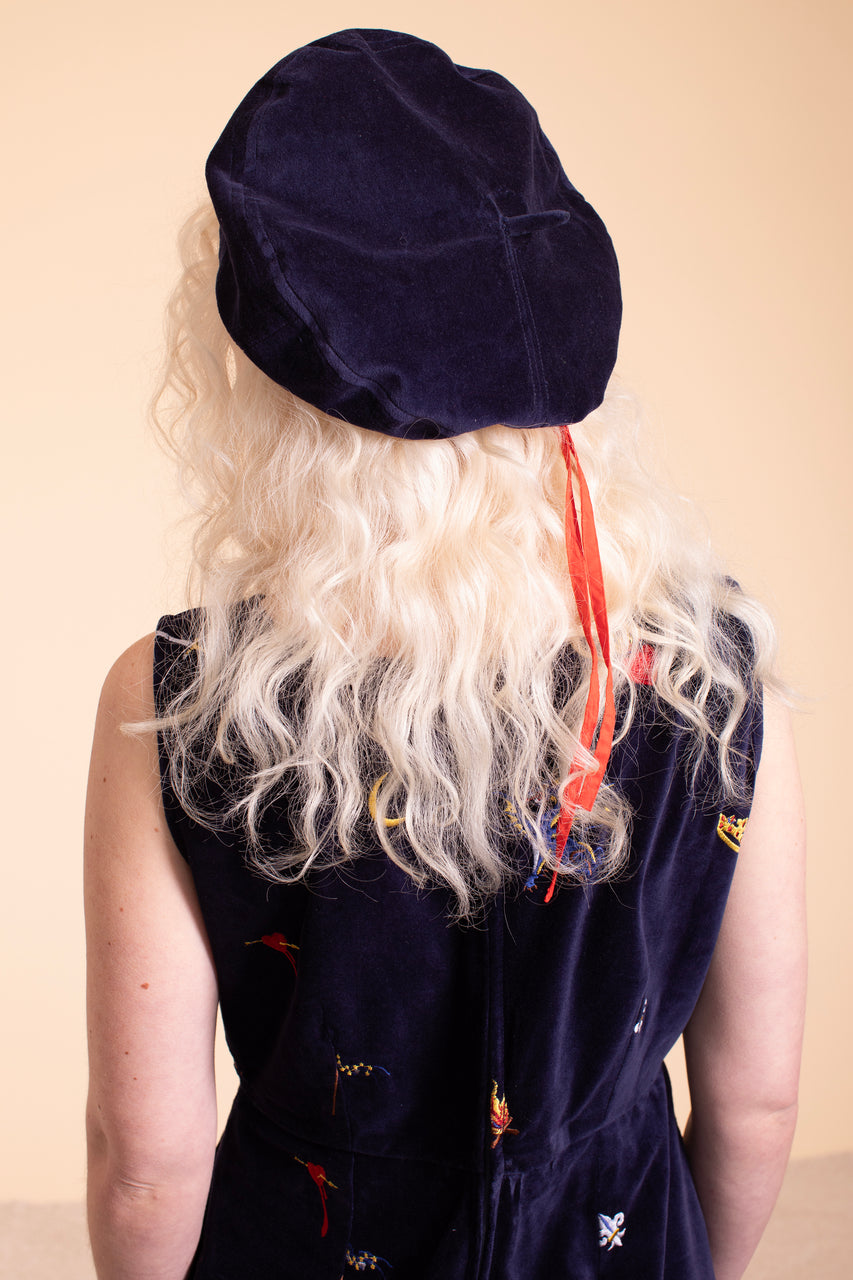 This magical little hat is a cut and sew beret, the perfect to compliment the velvet pieces in the Joan of Arc collection! The hat band is finished with an adjustable red accent drawstring so it can fit just right. Fair trade made in India with 100% cotton midnight velvet.