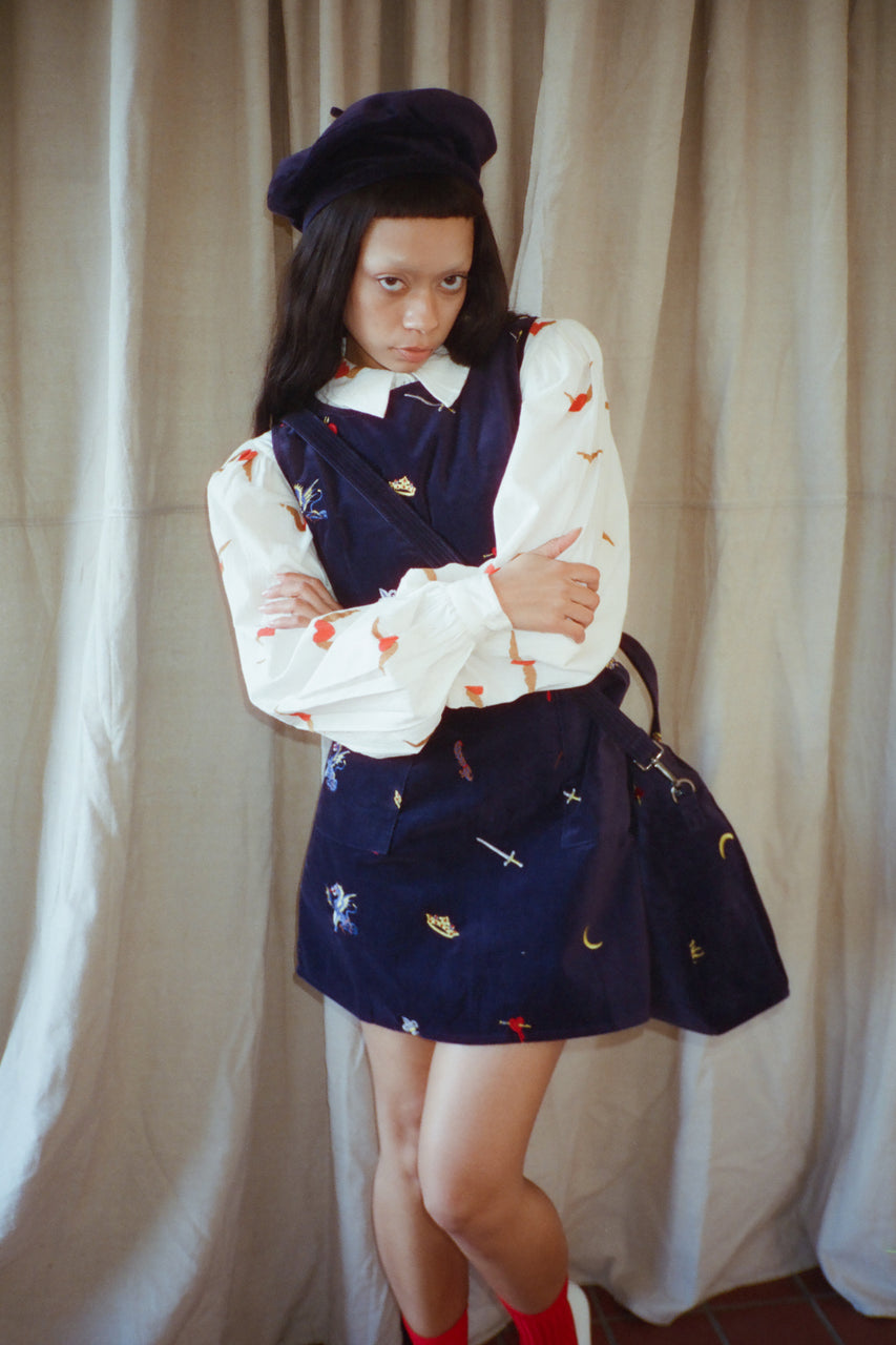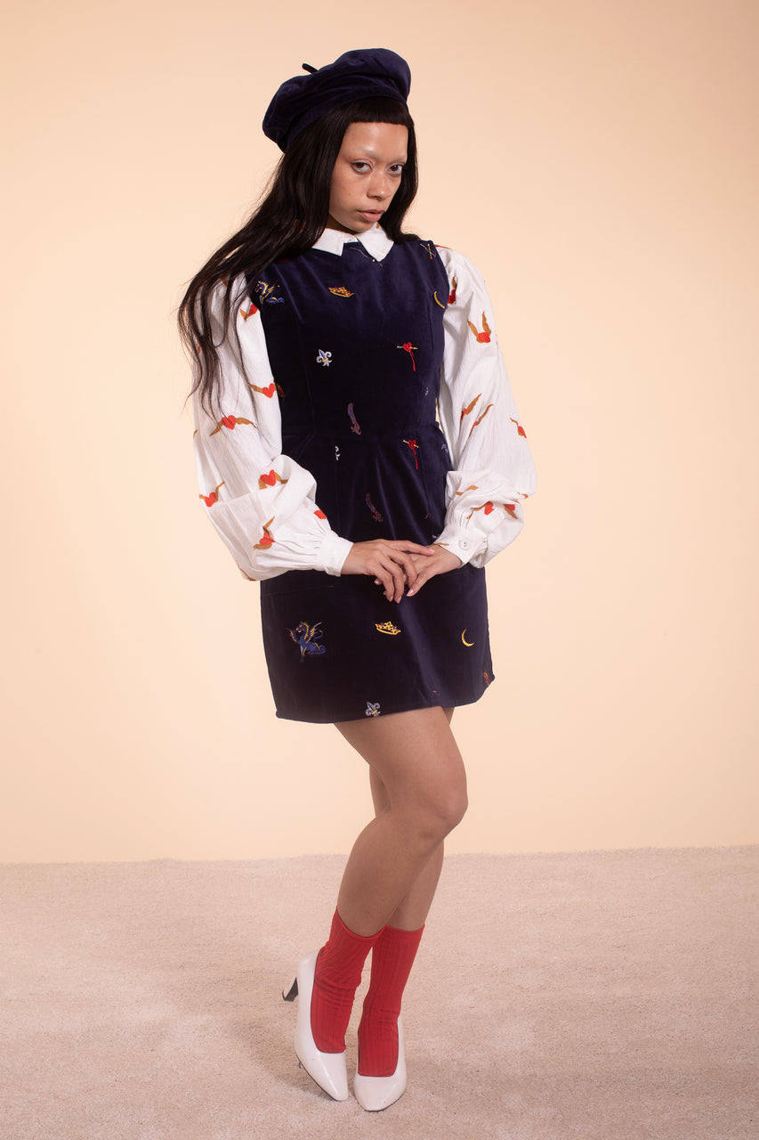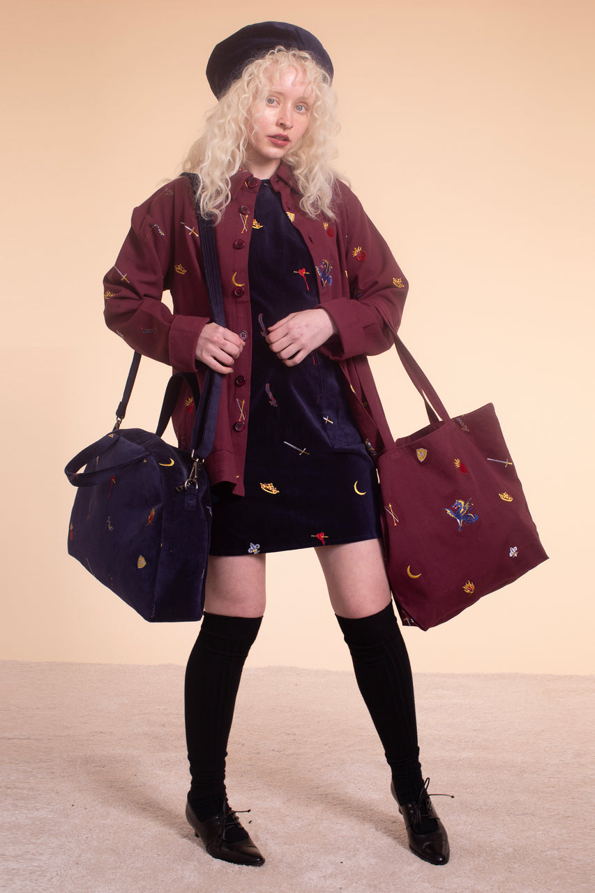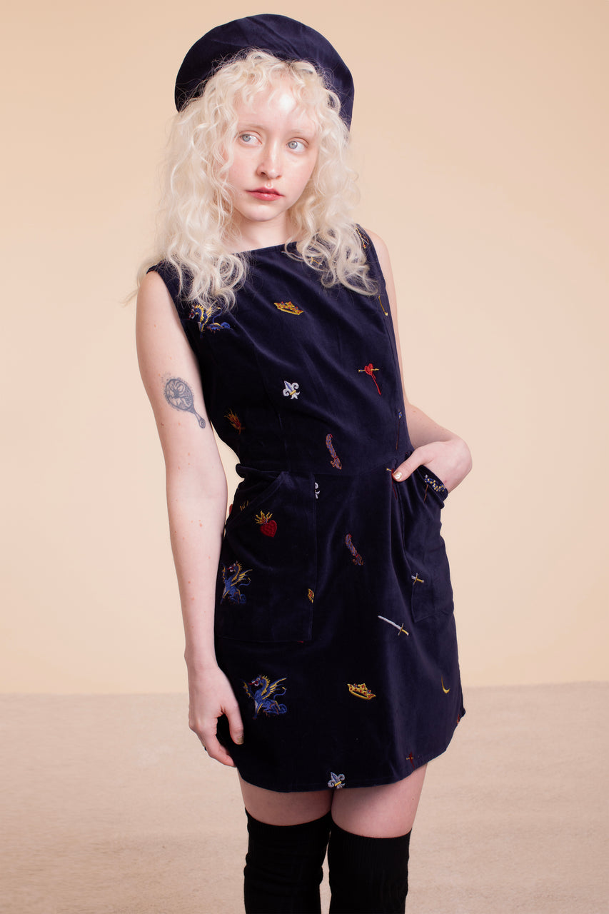 This magical little hat is a cut and sew beret, the perfect to compliment the velvet pieces in the Joan of Arc collection! The hat band is finished with an adjustable red accent drawstring so it can fit just right. Fair trade made in India with 100% cotton midnight velvet.