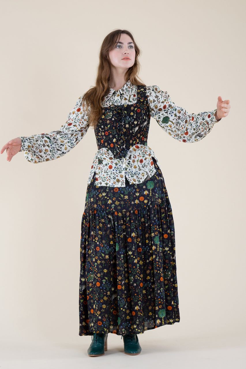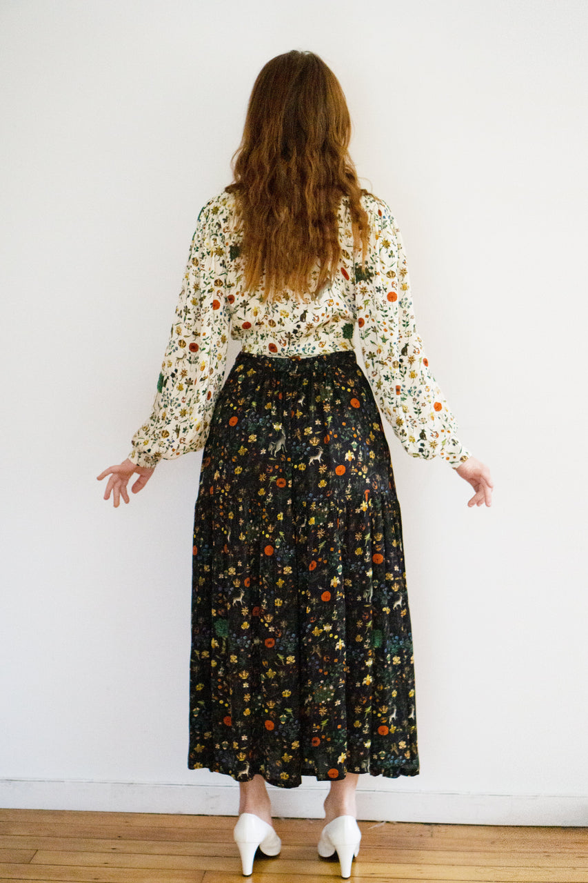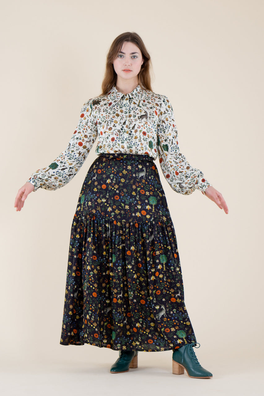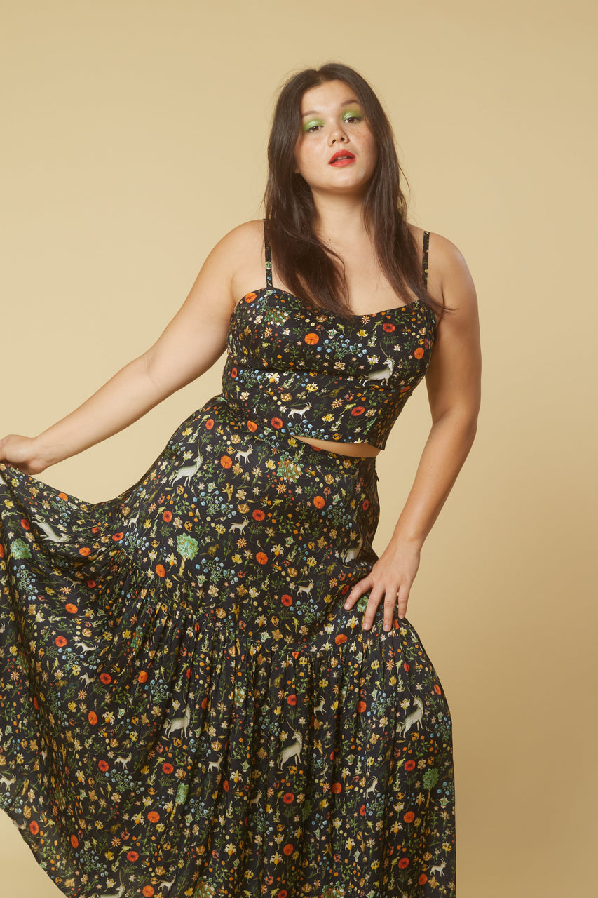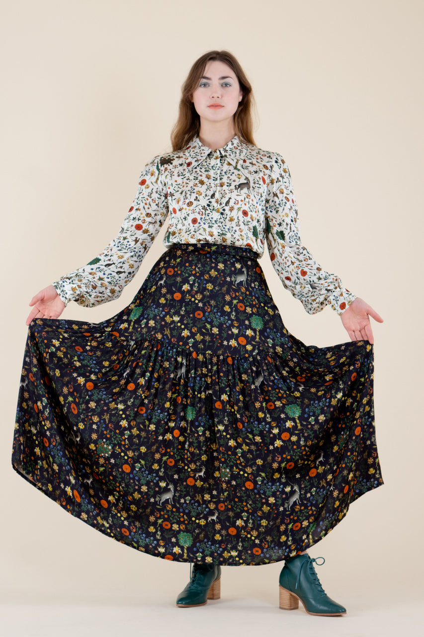 The Freda Skirt in our Black Illuminated print is back! It's new and improved with elastic and some shirring at the back of the waist making it oh so flattering at the hip and the skirt more voluminous. It has a side zip with button. Fair trade made in India in cotton poplin. Size Guide
