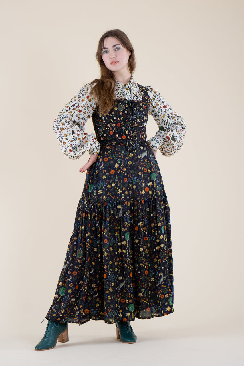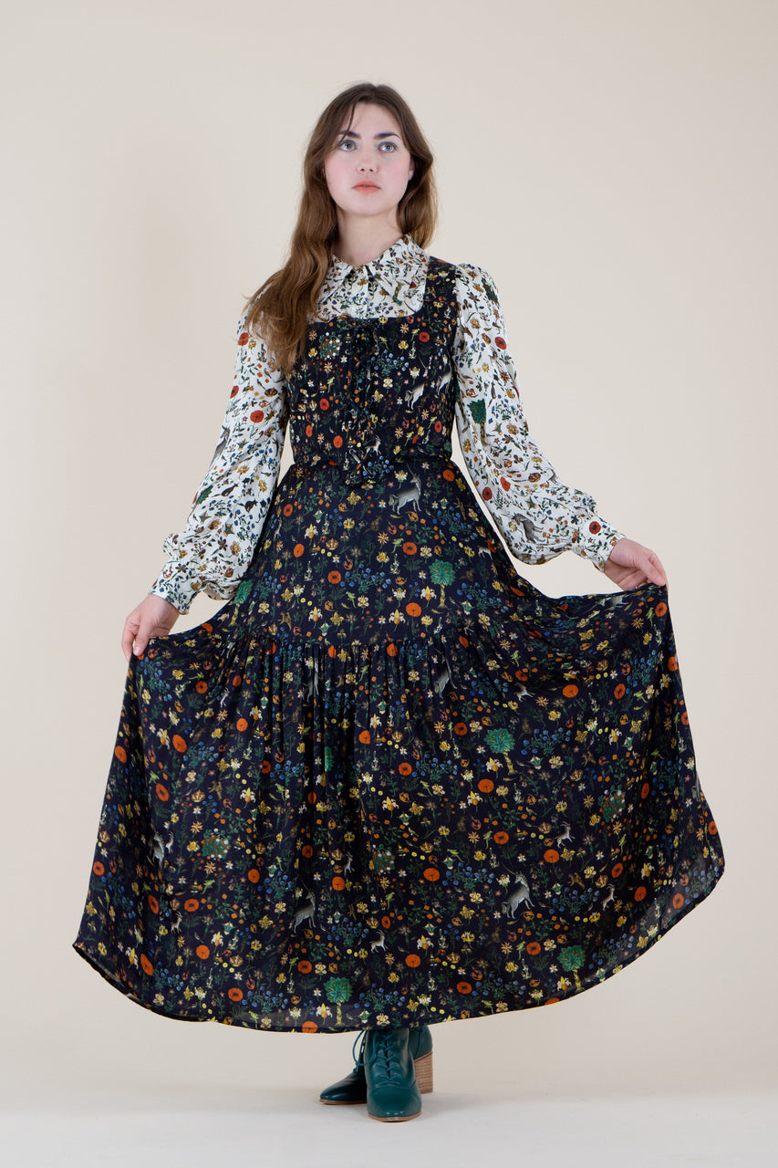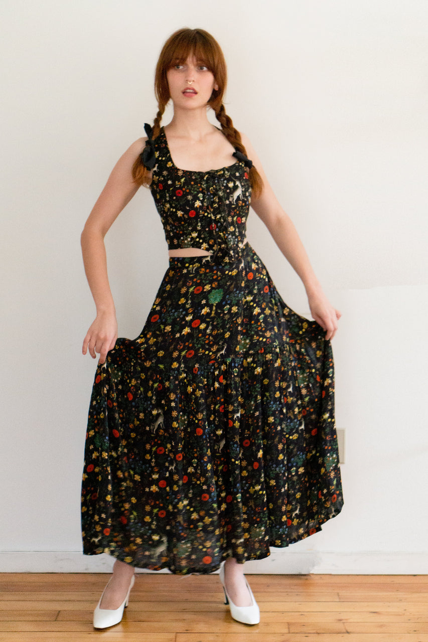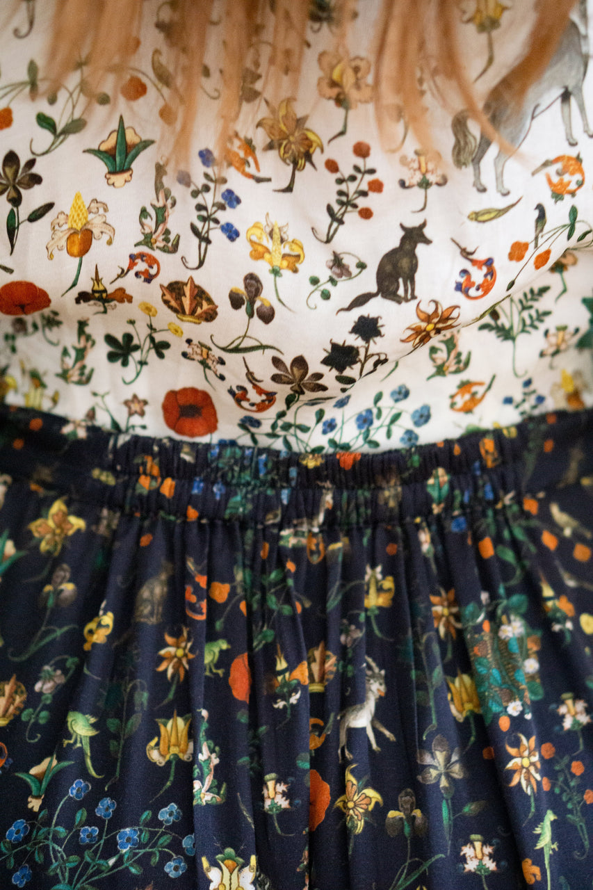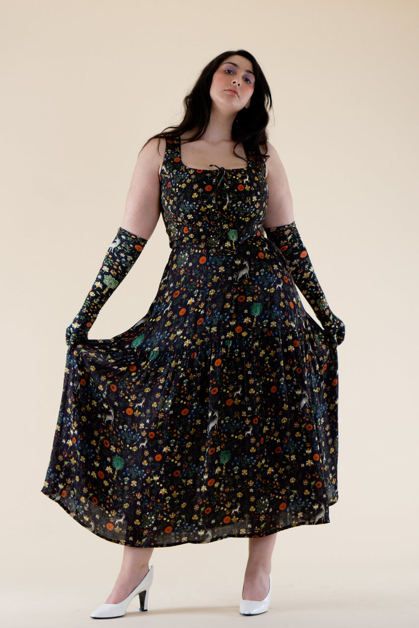 The Freda Skirt in our Black Illuminated print is back! It's new and improved with elastic and some shirring at the back of the waist making it oh so flattering at the hip and the skirt more voluminous. It has a side zip with button. Fair trade made in India in cotton poplin. Size Guide
