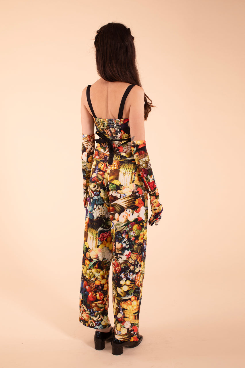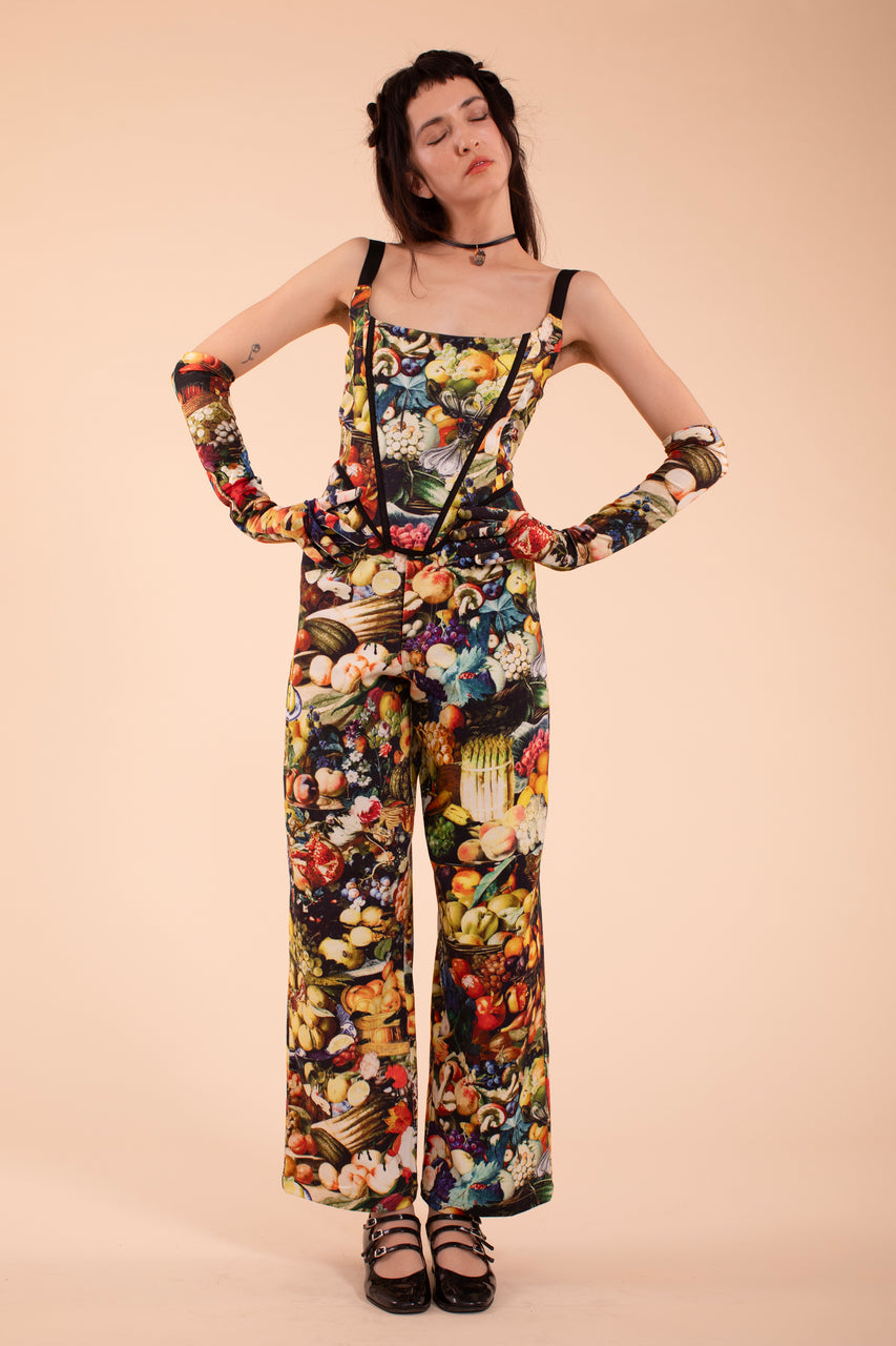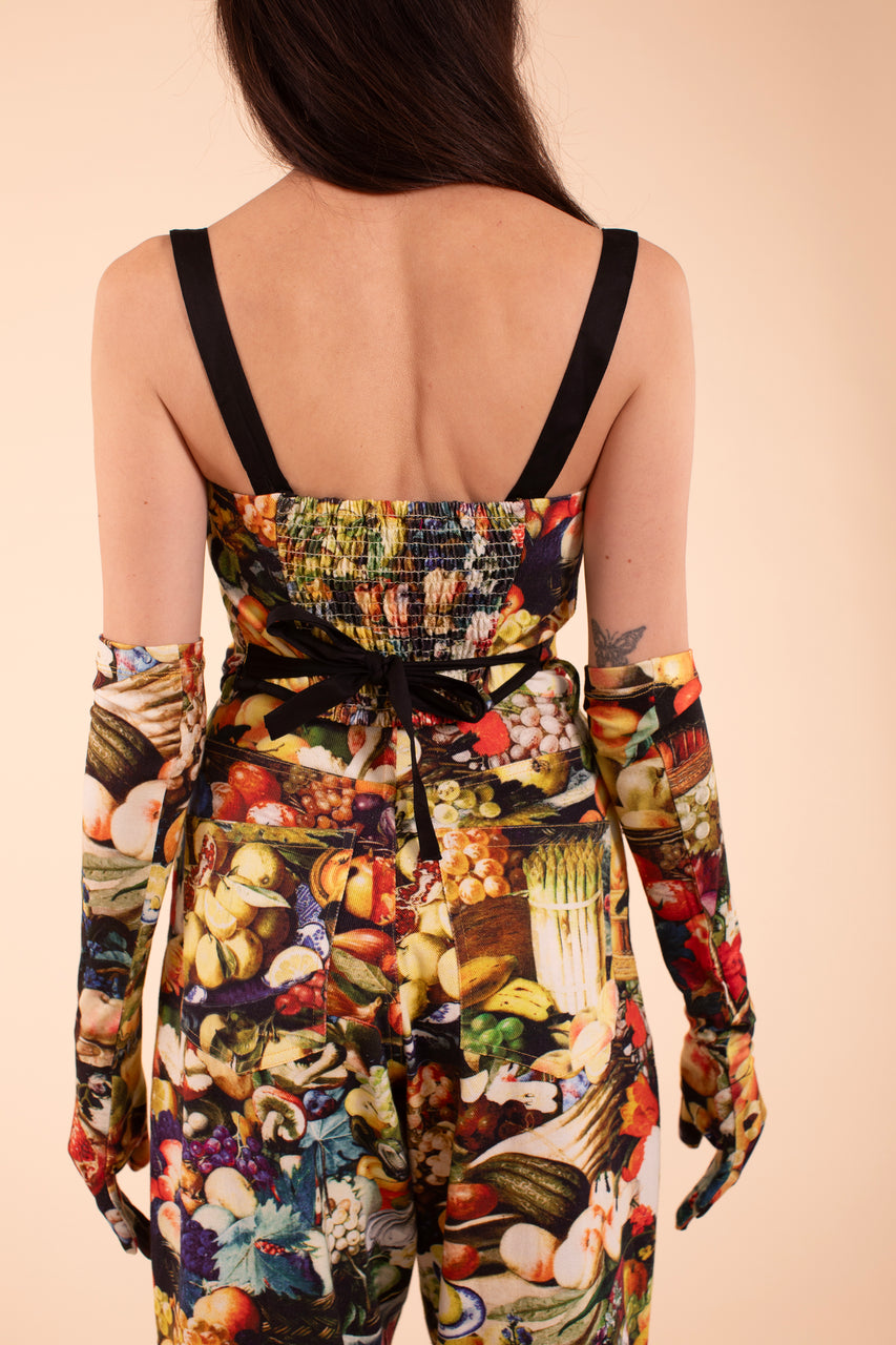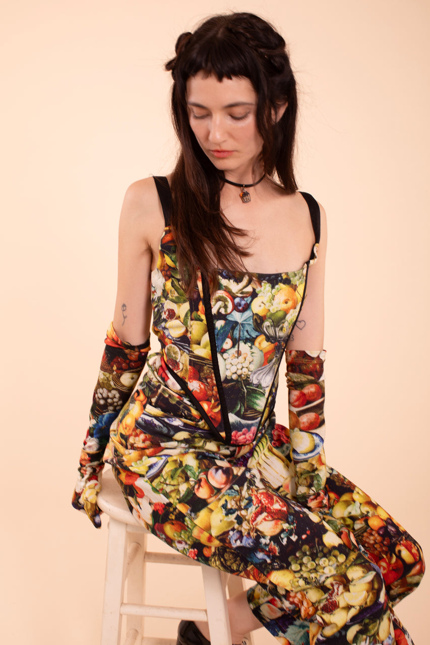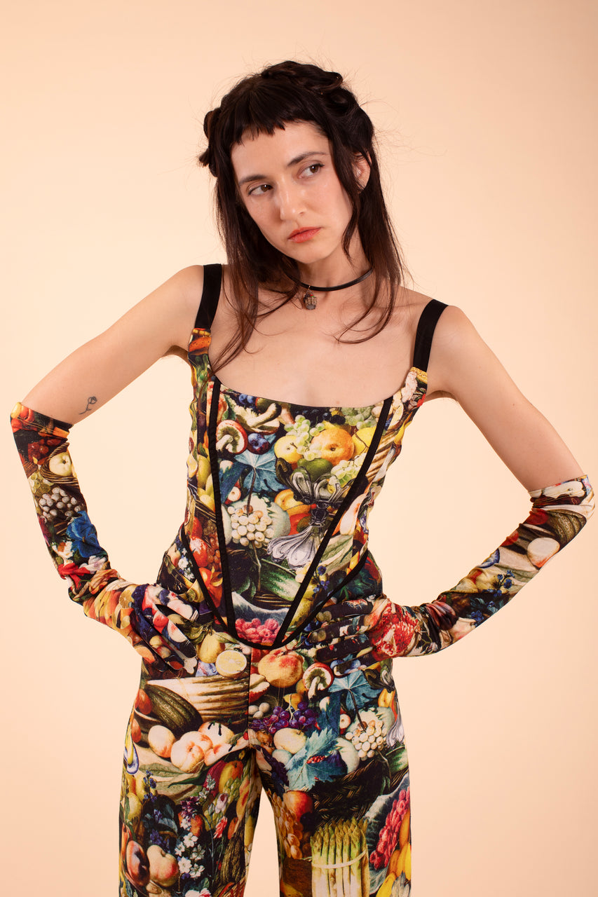 Our Muse Corset is a dream in our classic Harvest Print. The black trim details makes the print pop in the most delectable way. Made in a cotton twill with metal wire boning so it will never get out of shape. There is a wide elastic panel in the back for stretch so it will fit just so and the straps are ajustable. 100%Cotton canvas with Fully lined in 100% cotton lining, fair trade made in India. Size up if between sizes, there is also a waist tie for an extra cinch! Each one the print panels are a little different making it special on its own with no other exacly like it Size Guide
