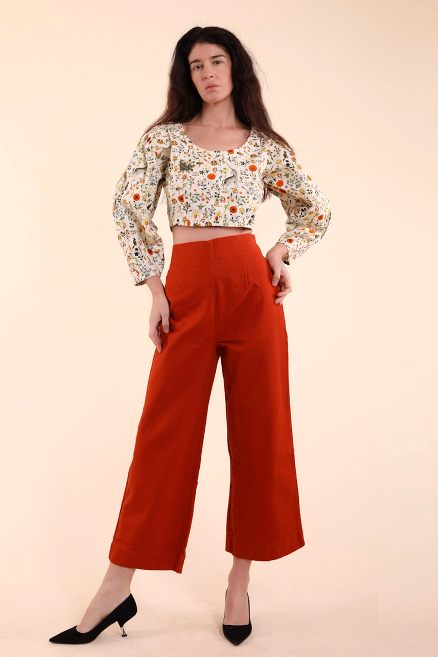 These iconic Hannah Kristina Metz Archival Pants are made in a Heavy 100% cotton canvas in a vibrant Paprika The signature side zip high waisted cut with no waistband creates clean, elegant lines, while the dreamy shield shaped back pocket adds an unexpected detail that makes these truly special Size 0 is 25" at the waist, 2 is 26" size 4 is 27" & 6 measures 28" size 8 measures 29"and 10 measures 30" at the waist. First model wears size 2 and 2nd model wears size 4