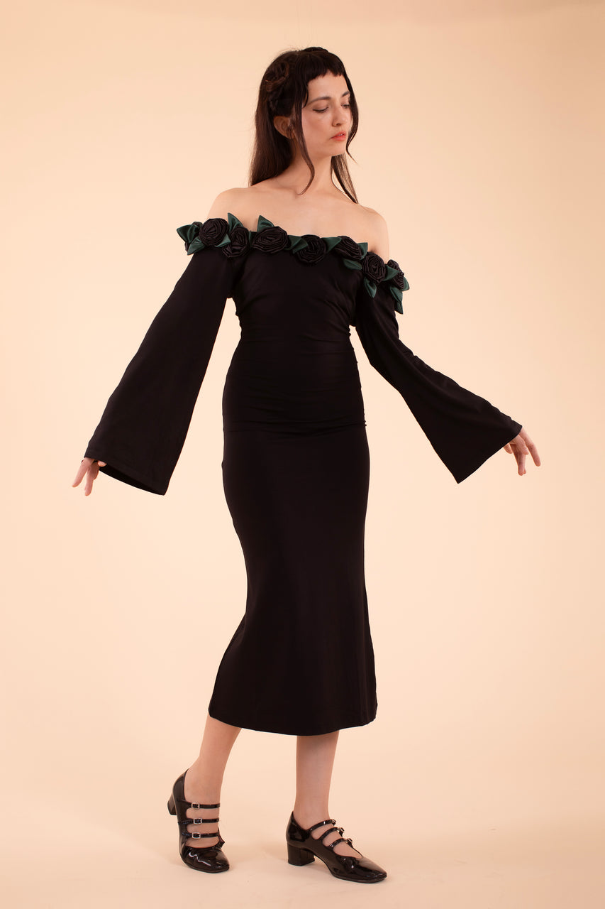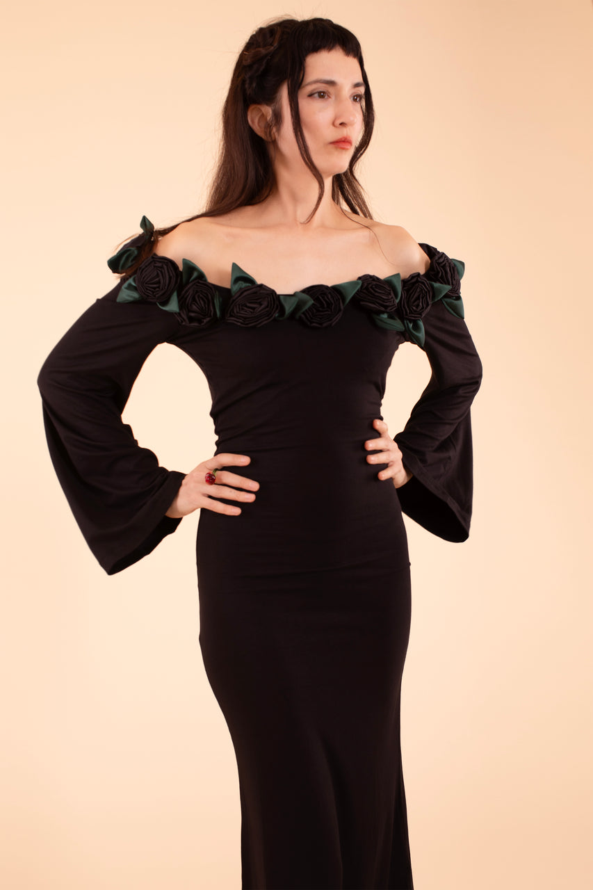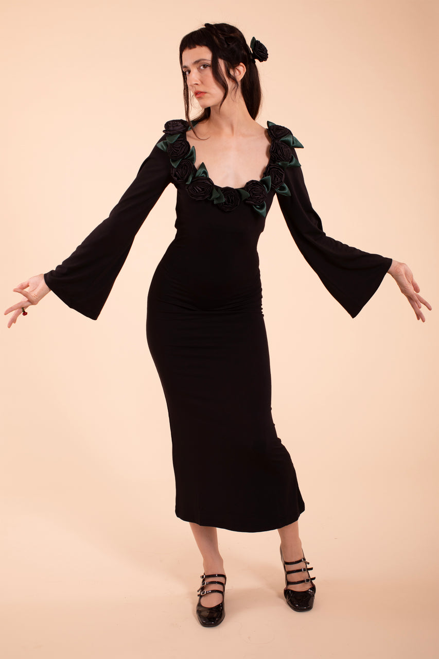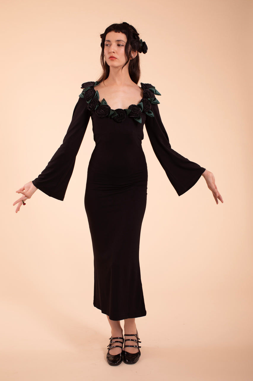 This magical persephone rose Belladonna Dress is gorgeous, made in a stretchy and cotton silk jersey with a little lycra, with front wreath of handmade silk black roses and green leaves. Fair trade made in India