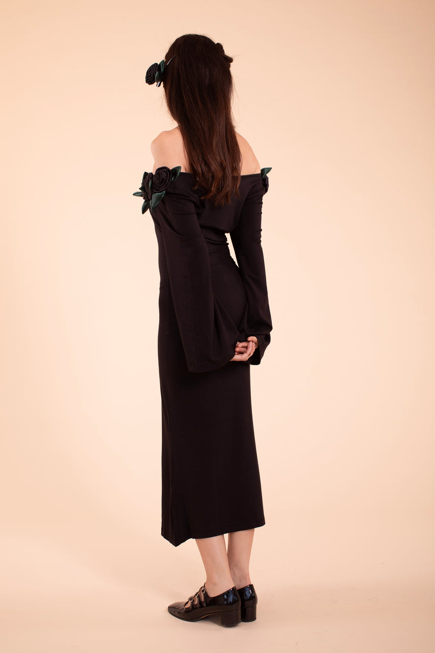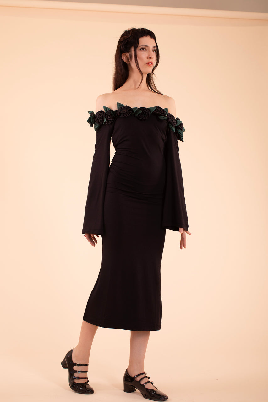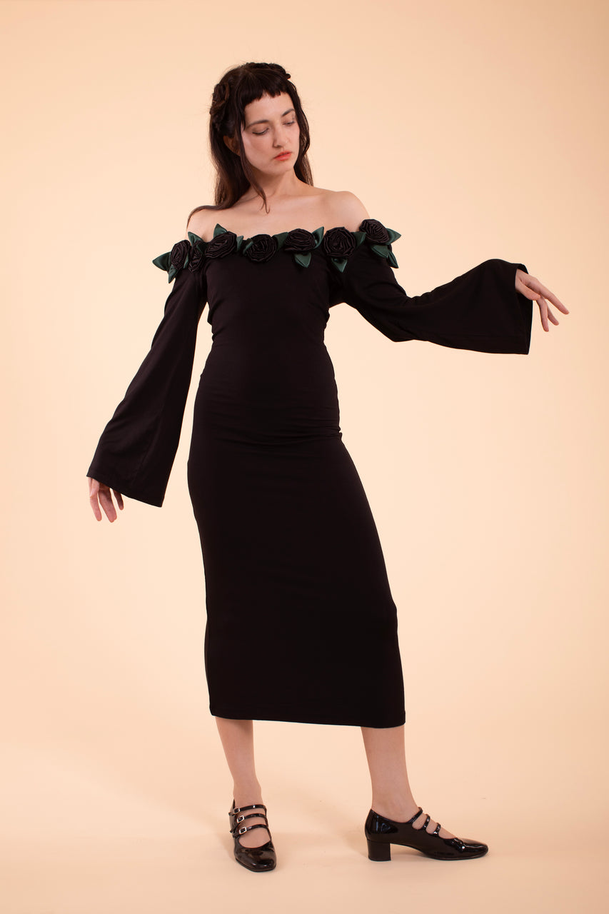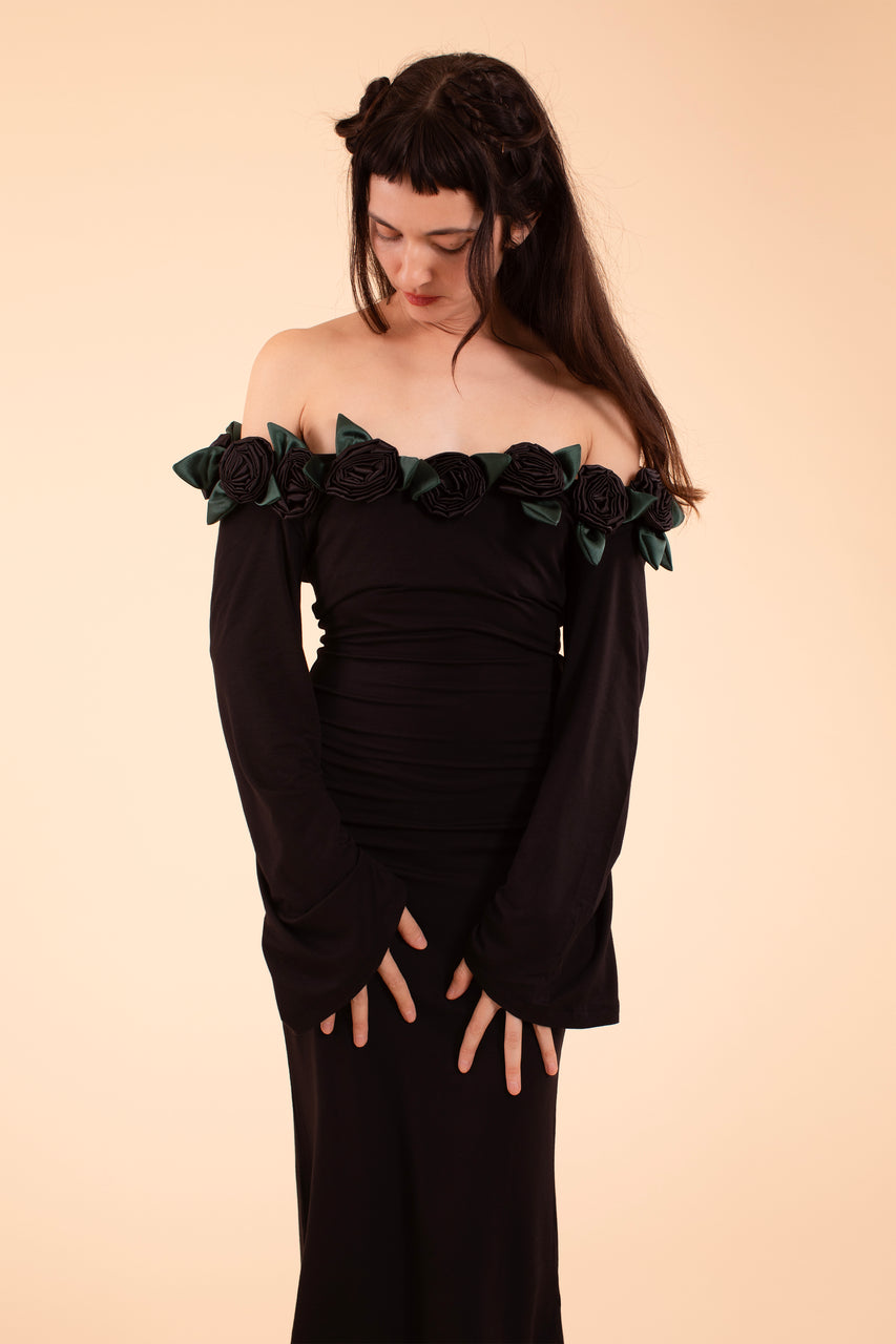 This magical persephone rose Belladonna Dress is gorgeous, made in a stretchy and cotton silk jersey with a little lycra, with front wreath of handmade silk black roses and green leaves. Fair trade made in India